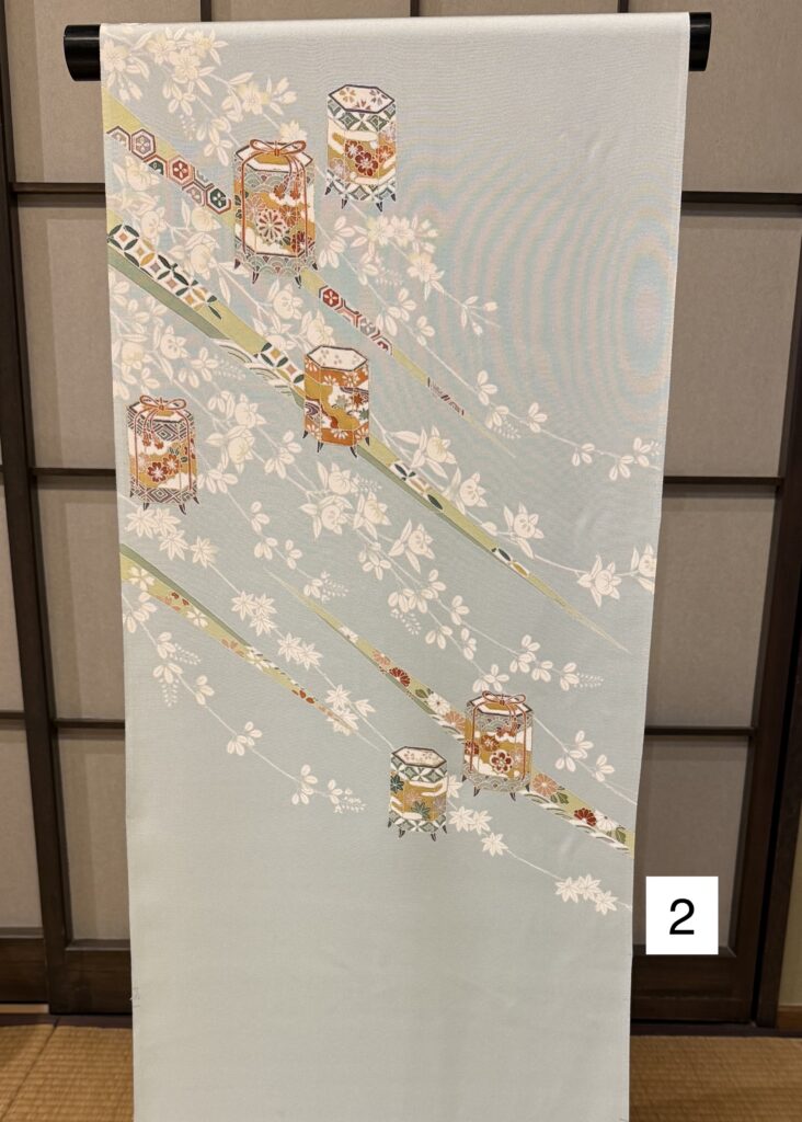 2)着物/付け下げ/水色/貝合わせ柄3)帯/夏帯/絽/丸抜き花柄