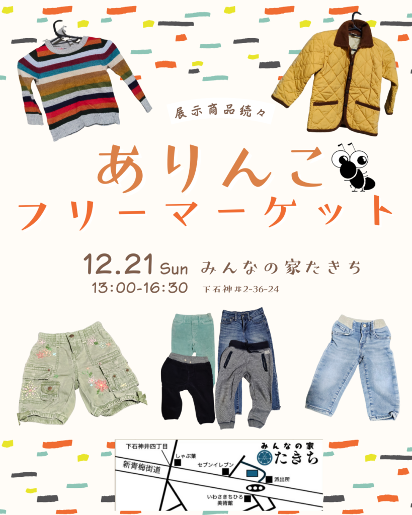 12/21(日)13:00~16:30 ありんこ食堂×みんなの家たきち フリーマーケットを行います。