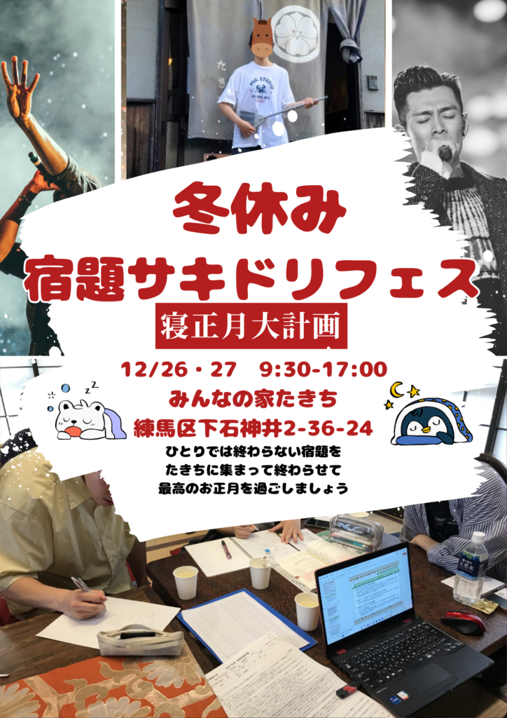 ひとりでは終わらせられない冬休みの宿題を、たきちに集まって、みんなで仲良く終わらせて、今年のうちに身軽になりましょう(笑)